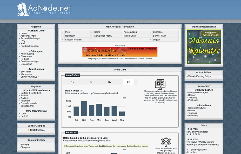 Ich bin im Netz immer vorsichtig, wenn es um „leichtes Geld“ geht. Aber AdNade hält sich schon seit Jahren wacker am Markt. Deshalb habe ich beschlossen, das Ganze mal genauer unter die Lupe zu nehmen – und zwar nicht nur die bekannte Surfbar, sondern das volle Programm. Spoiler vorab: Wer die richtigen Kniffe kennt (Stichwort PTP), kann hier mehr rausholen als gedacht.